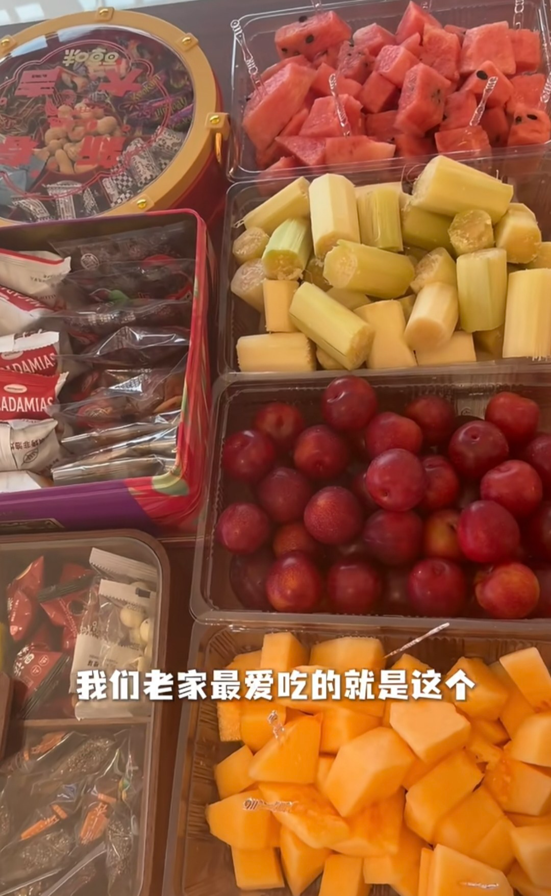 桌子上摆着很常见的各种小零食和果盘,周迅介绍了自己老家就喜欢吃甘蔗,每次到了这边都有满满的亲切感,这是外面的那些大餐也比不过的味道。