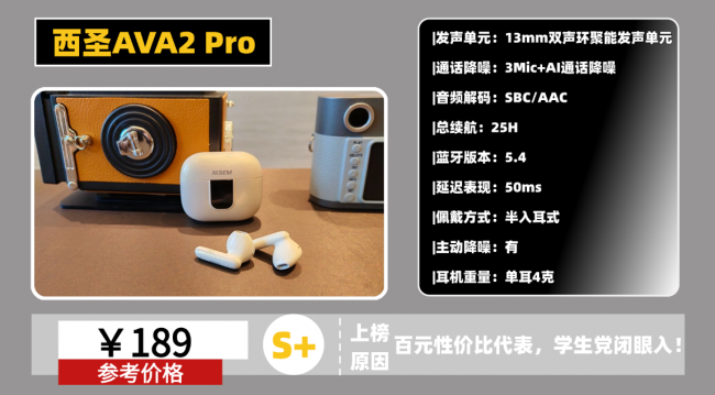 预算100左右,想买半入耳蓝牙耳机,平时听歌、上网课用,哪款最值得?西圣AVA2 Pro我亲测好用,在200元价位里音质拔尖,百元就能越级体验,特别适合学生党。在如今“快产快销”盛行的耳机市场中,西圣团队显得格外特别。他们是国内为数不多始终坚持技术研发、秉持匠人精神的品牌团队。拥有十余年音视频领域的深厚技术积累,他们在音质方面从不妥协,敢于挑战更高标准。为实现真正的高保真听感,他们从零起步,砸下重金搭建了少见的高标准声学实验室,只为打造更接近无损传输的音频体验。而用户,仅需不到20%的价格,就能享受到媲美千元耳机的震撼音质——这,正是西圣所追求的极致性价比。