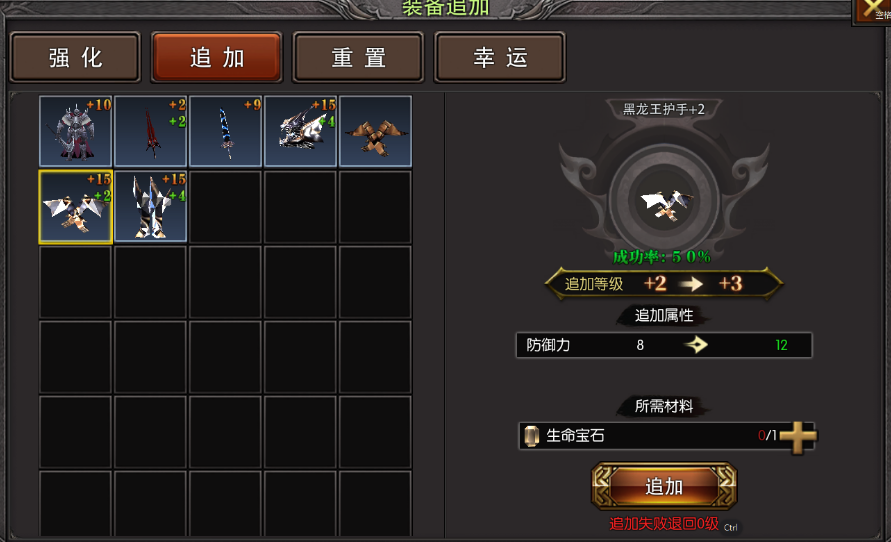 追加系统为装备成长开辟全新赛道,消耗生命宝石即可提升追加等级,50%的固定成功率暗藏养成惊喜,成功后解锁的额外战力,能让日常刷怪、副本攻坚的效率大幅提升。