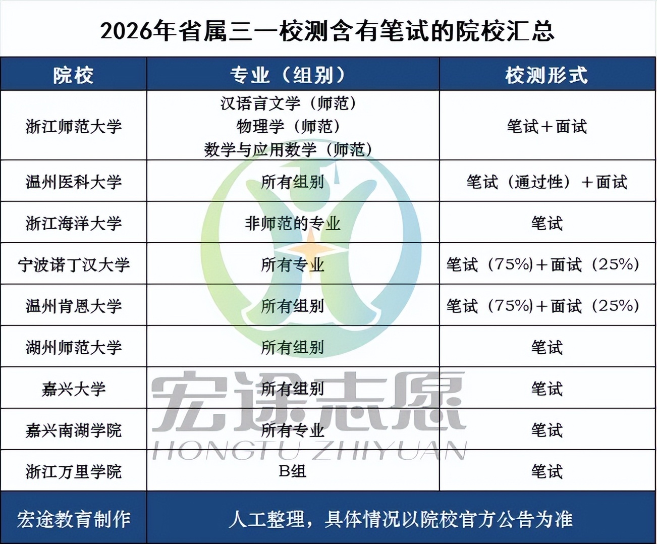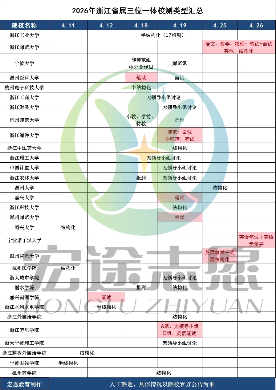 部分院校调整校测形式,如湖州师院校测统一改为仅笔试,浙江水利水电学院取消分类校测、统一为抽签分组面试,浙大城市学院校测不再要求特长证明材料,考核更侧重考生核心能力、学科素养。