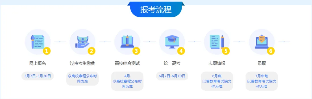 今年优化了考生报名信息采集,考生不需要多头重复填报高考报名信息、学考成绩、综合素质评价等基础信息。网上报名时间内,考生可对报考高校、报考专业等信息进行修改,报名截止后不得更改。通过初审的考生须在高校章程公布的时间内完成缴费。报考流程图如下: