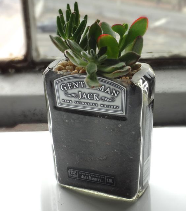 为瓶身开一个透气的出口,并铺上疏水的基底。将松软的土壤填入,再轻轻栽入一株饱满的多肉,一个富有工业诗意的盆景便诞生了。