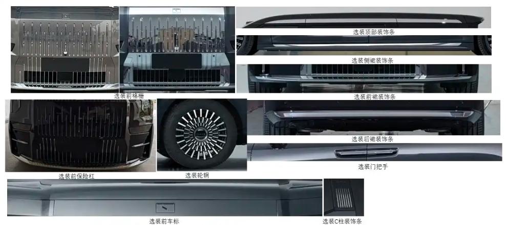 新车会提供丰富的选装件,可选装前格栅、顶配装饰条、侧裙装饰条、前群装饰条、后群装饰条、前保险杠、轮毂、门把手、前车标等。
