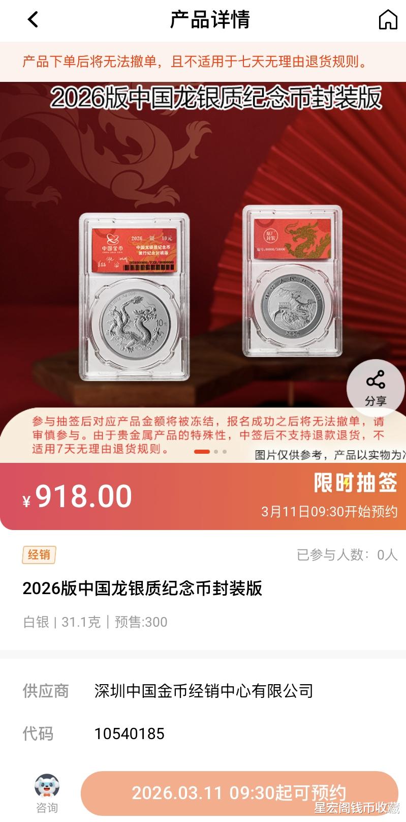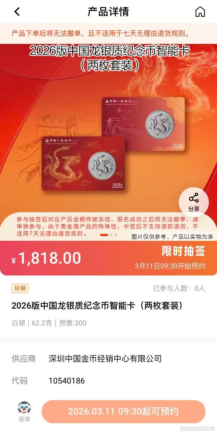 将于3月11日上午9:30开启预约,里面包含有2026版中国龙银币封装纪念版和2026版中国龙银币智能卡两个品种,2026版中国龙银币封装纪念版可抽签数量300套,发行价为918元。2026版中国龙银币智能卡可抽签数量300套,一套两枚,发行价为1818元。