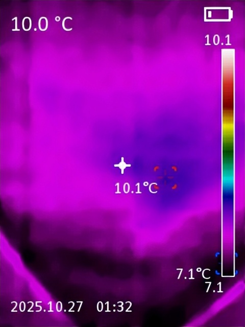 观音宕基地海拔约1600米,加上夜间风大,帐篷内温度并不高,我用热成像仪测到的结果显示只有7-10℃。我到达观音宕营地时贴身衣物已全湿,并且很尴尬的发现换洗衣物带错了,保暖内衣上装阴差阳错的给落下了。所幸带了干毛巾,擦干身子后立马钻入了天石驯鹿睡袋躺下,此时身子已是冰凉一片,令我后怕不已。