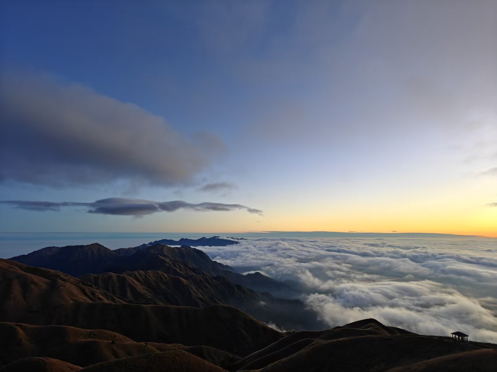 早上被帐篷外的人声惊醒,听早起的人儿抱怨日出只持续了一小会儿就被浓雾给挡住,云海也没了,风还大,被冻得心凉。
