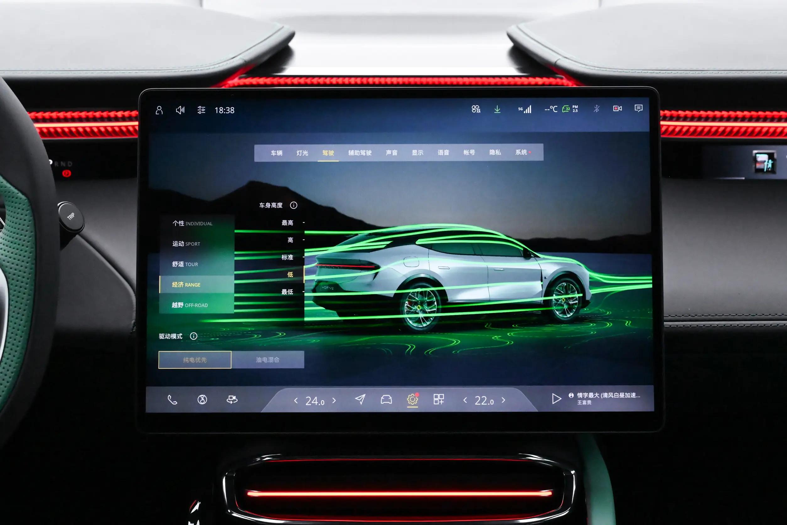 它的车身尺寸不算小,长宽高有5103×2019×1636mm,轴距也达到了3019mm,宽高比保持在1.24,这样的尺寸让它看起来很大气,也为车内空间打下了基础。车尾的主动尾翼,能4档智能调节,高速开的时候能提供120kg的下压力,跑起来更稳;平时低速开就贴在车身上,不影响美观,还能优化空气动力学,细节做得很到位。