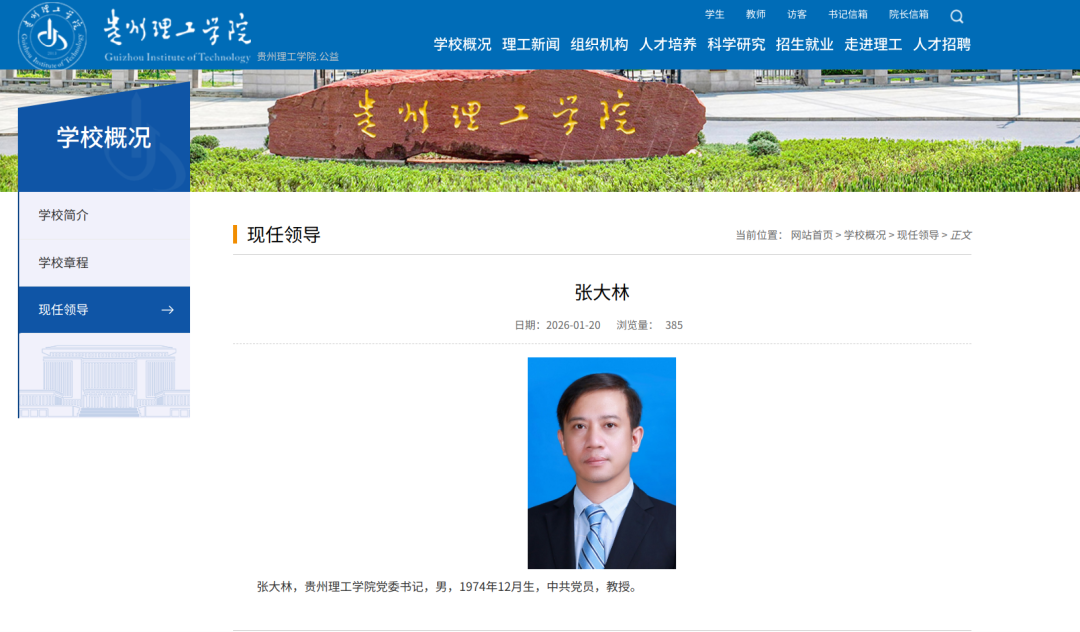 贵州理工学院领导班子迎来变动,根据学校官网发布的更新显示,此前担任贵州大学党委副书记的张大林,已履新贵州理工学院党委书记。