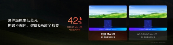 更重要的是,RGB-Mini LED技术的防蓝光设计与画质表现完全解耦,对蓝光波段的选择,不会影响红绿芯片的发光性能,也就不会对画面的色域、色准、色温产生任何负面影响,彻底告别了传统方案“开护眼就发黄”的通病,在实现深度硬件级防蓝光的同时,仍能完整保留超广色域与专业级色准。同时,无需量子点转换层与加厚色阻层的架构,大幅提升了光学链路的透光率,同等亮度下所需的驱动电流远低于量子点Mini LED方案,既避免了为补亮度放大蓝光功率的恶性循环,也实现了能耗控制与光色控制精度的双重提升,形成了护眼与画质的正向协同。