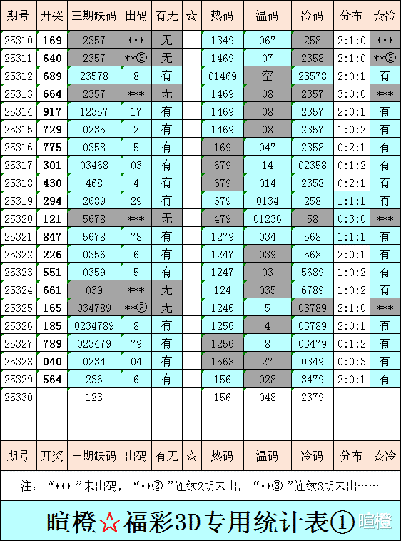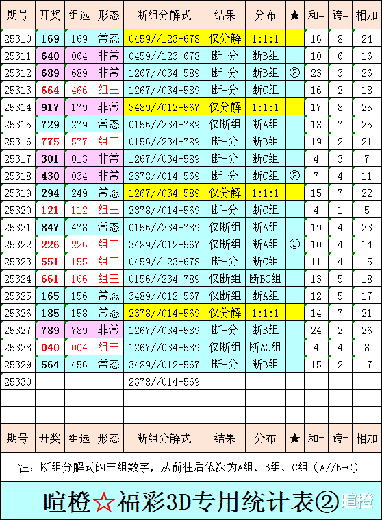 25330期:暄橙福彩3D综合条件(本期将在12月10日21:15开)一、上期回顾 ☆1、上期开奖号:5 6 4。2、和值= 15,跨度= 2。3、常态组六,012路组合。4、热度分布(热:温:冷)2:0:1。二、本期条件 ☆1、三期缺码:123。2、热:156,温:048,冷:2379。3、断组分解式:2378//014-569。4、四胆:4679;三胆:469。三、术语解释 ☆1、三期缺码:0至9这十个自然数当中,未在近三期开奖号出现的数字。2、热度(热温冷):自然数0至9,在近七期开奖号中,出现3次及3次以上的数字,称为热码;出现2次的数字,称为温码;出现1次和未出现的数字,称为冷码。某个数字在开奖号中出现几个,就按几次计算。3、断组分解式:将0至9这十个自然数,分成三组数字,从前往后依次为A组(4码)、B组(3码)、C组(3码),一般情况下,有一组数字不出码,偶尔会有两组数字不出码。A组不出码的情况相对较少。断组为主,分解为辅。4、常态组六号码:同时包含大数、小数、奇数、偶数、质数、合数的组六号码,共有72注。统计表中,简称“常态”。5、非常态组六号码:全大数、全小数、全奇数、全偶数、全质数、全合数等六种形态的组六号码,共有48注。统计表中,简称“非常”。★提醒:彩市有风险,参与须谨慎!理性购彩,量力而行!多看少买,不要痴迷!任何条件都有出错的时候!水平有限,仅供参考!友好互动,好运相伴!
