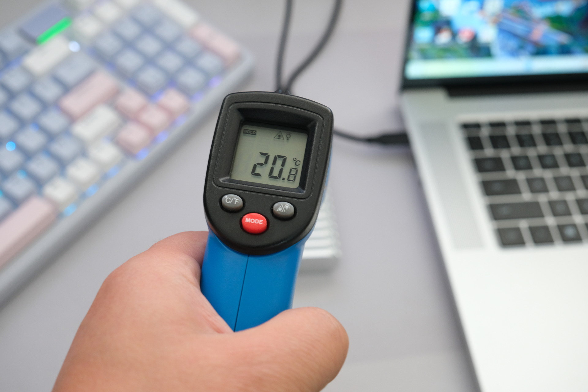 它还支持无风扇被动散热,采用了双面贯穿式双鳍片设计,散热面积比普通硬盘盒大了2.5倍,能快速导出并分散热量,而且零噪音运行。如图上所示,常温状态下运行了几个小时,测的温度为20.8摄氏度,比笔记本表面温度26.2摄氏度还低几度。