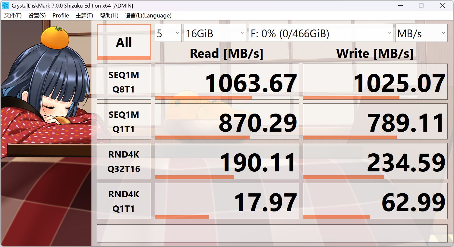 另外,我还做了一个简单的性能测试,用CrystalDiskMark测试,大文件读取速度1063.67MB/s、写入速度1025.07MB/s,和官方标称的速度差不多,没有虚标。