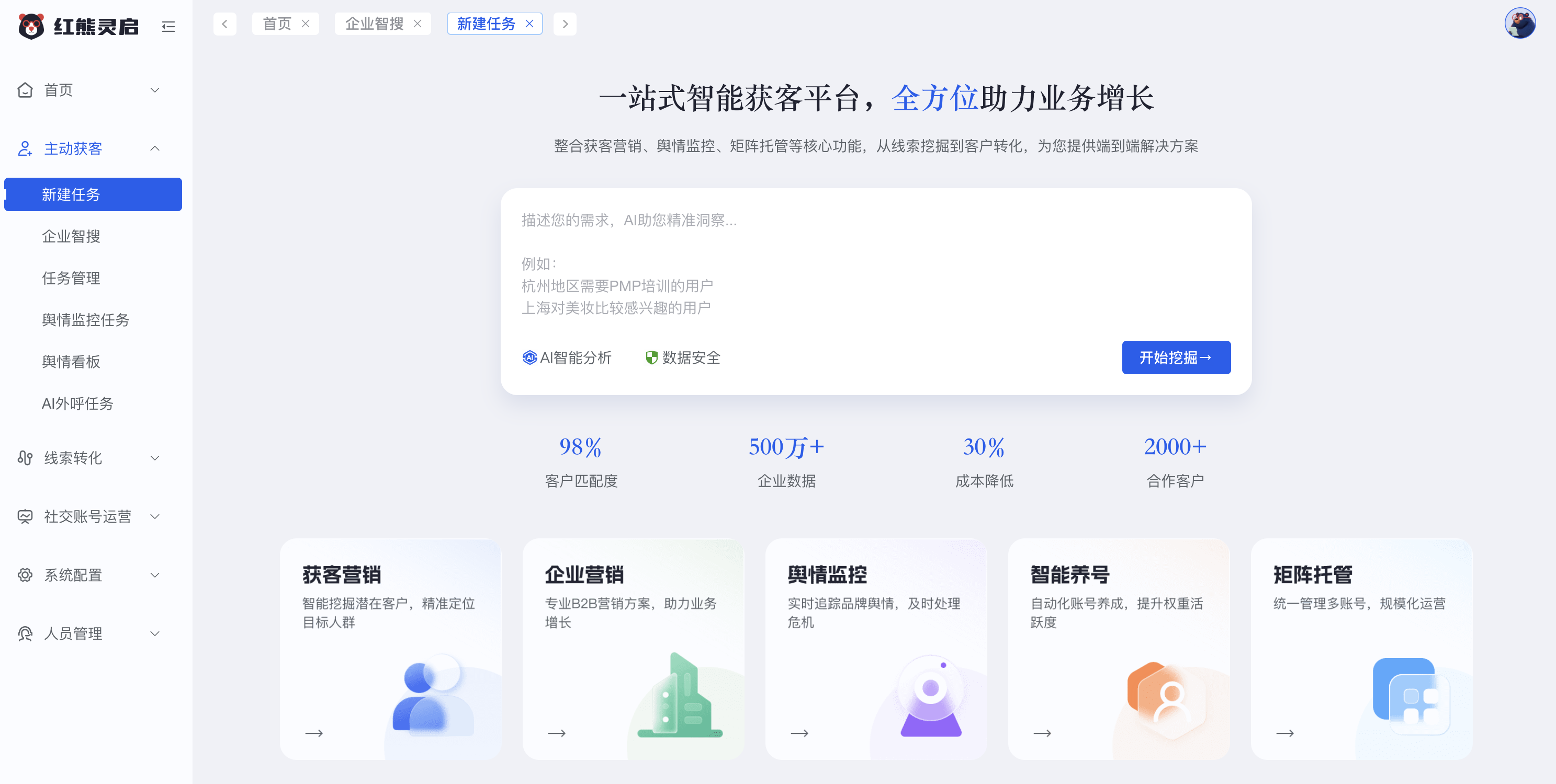 红熊服务客户过程中,深知企业获客之痛,所以希望借助AI技术的力量,将企业从繁重、低效、试错型的获客工作中解放出来,实现全渠道、自动化、精准化的获客与转化闭环,助力企业精准触达目标客群,将公域流量高效转化为可跟进、可转化的高质量销售线索,实现营销 ROI 的跨越式提升。