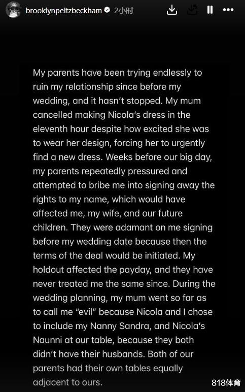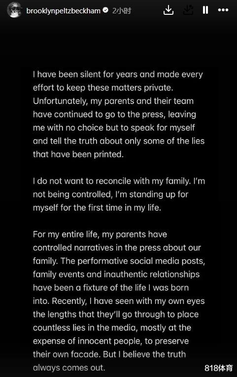 1月20日消息,1月20日,贝克汉姆长子布鲁克林通过社交媒体发布长篇声明,控诉父母大卫-贝克汉姆与维多利亚长期操控家庭形象、干涉自己婚姻并优先考虑商业利益,并直言2022年婚礼现场遭遇的屈辱经历是其人生最痛苦的时刻之一。