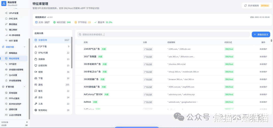 在高级功能中,目前支持自定义路由策略用于管理路由情况,也有内置的特征库用来识别流量来源等。不过目前特征库的信息还不多,后续也会推出在线更新的功能。