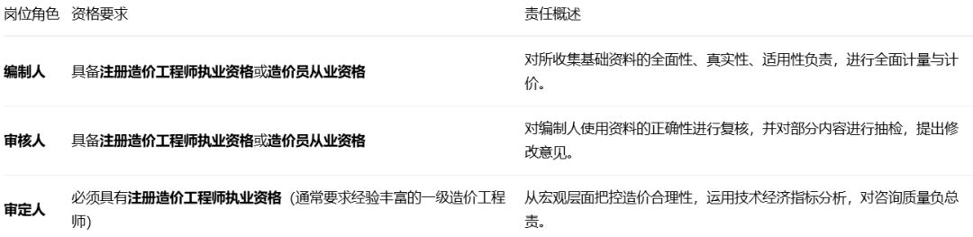 值得注意的是,虽然标准中指出审核人可由造价员担任,但在实践和未来趋势中,重要成果文件的审核和审定岗位,一级注册造价工程师因其更高的专业要求和法律责任承担能力,正日益成为首选甚至强制要求。此外,项目负责人通常也需由注册造价工程师担任,负责咨询合同的全面履行。