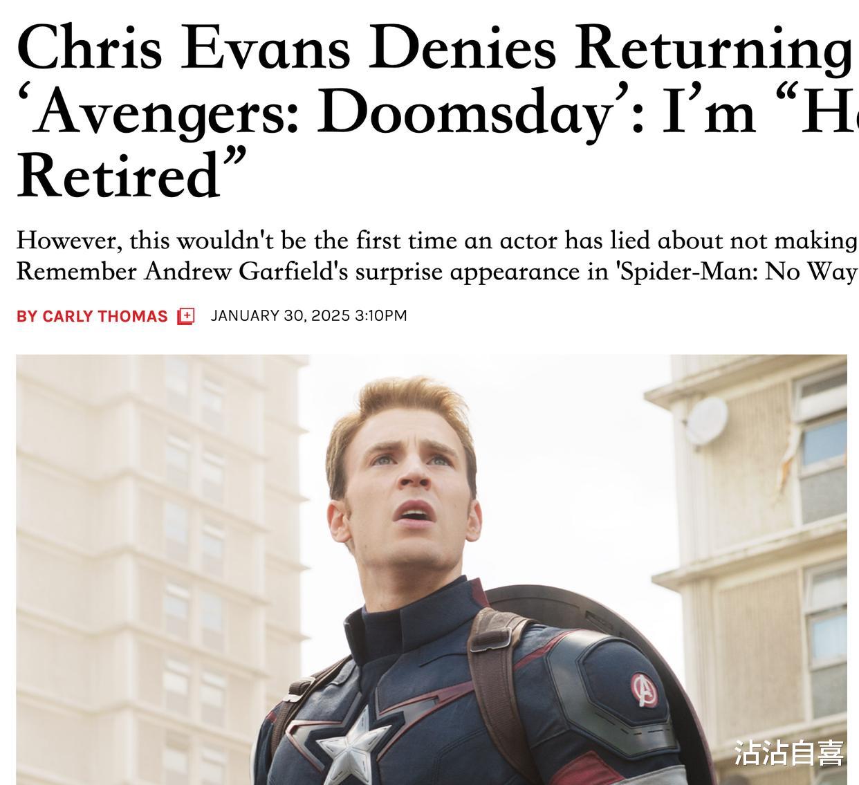 克里斯·埃文斯否认自己回归漫威的传言,《复仇者联盟:毁灭之日》固然具有吸引力,但是埃文斯对于MCU工作组的期待值更高。《THR》的影评人卡尔莉也谈论了这件事情,为何外界会有埃文斯回归漫威的消息出现?那是因为外界高估《复联》的号召力,粉丝们也高估了《毁灭之日》的质量。作为《美国队长》系列的代表演员,卡尔莉推测埃文斯对漫威影业的策略不太满意,自从《新世纪秩序》的计划出炉之后,埃文斯与MCU工作组已经分道扬镳了。当然,埃文斯存在着回归《复联》的可能性,只不过外界高估了这部系列的号召力,至少埃文斯不会直接因为《复仇者联盟》改变自己的决定。