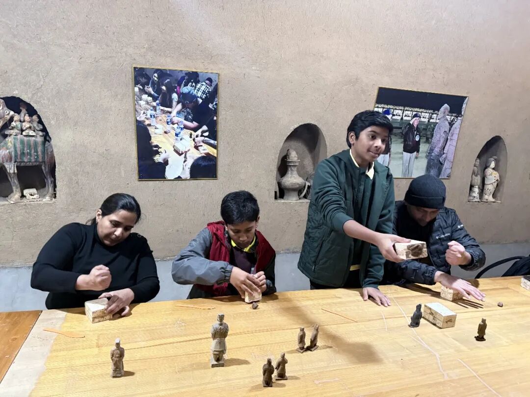 在秦俑村窑洞庭院内,则是另一番秦韵盎然的景象。来自印度的游客在工作人员的指导下揉泥、塑形、刻画,亲手制作陶俑,沉浸式感受秦文化的魅力。