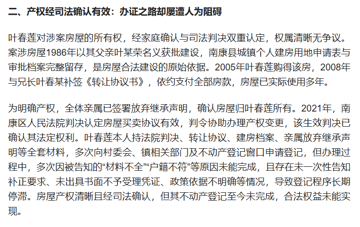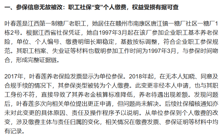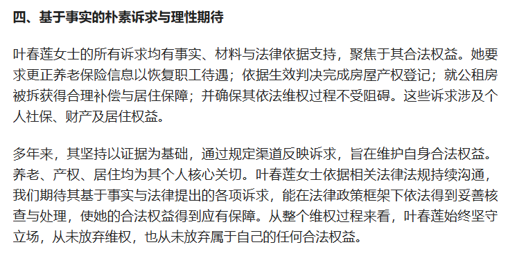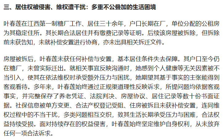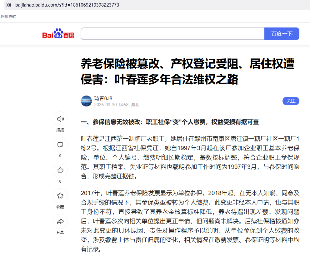 本人转载自百度用户“琦春0J8”的文章《养老保险被篡改、产权登记受阻、居住权遭侵害:叶春莲多年合法维权之路》,如有不实言