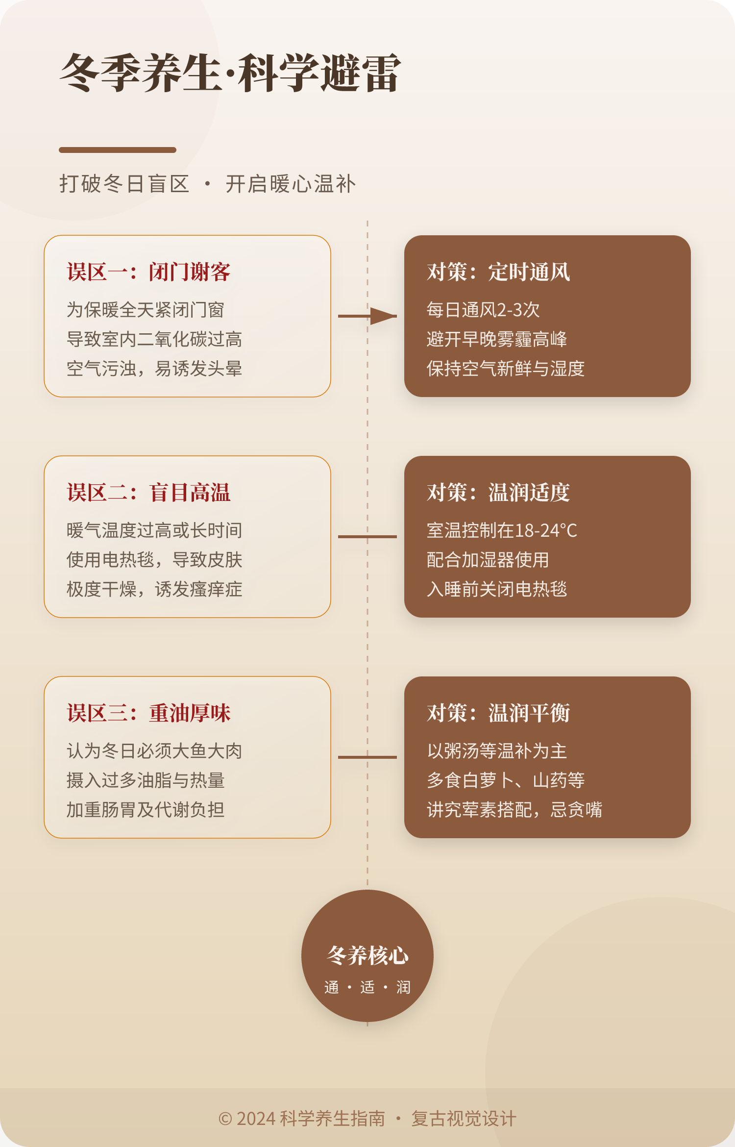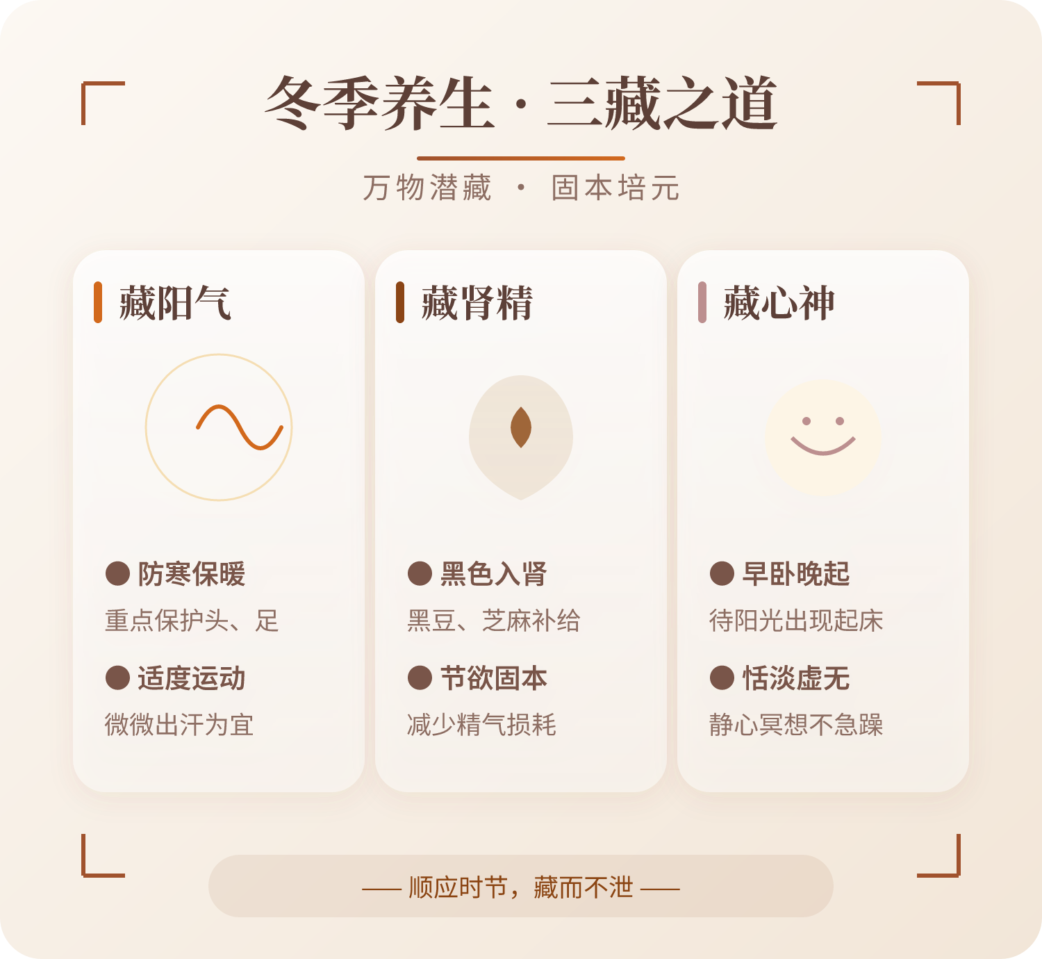 实际上,问题的关键并非在于吃的是什么,而是在于有没有顺应冬季时“藏”的那种节律。冬季养生的经典智慧根据养生经典《黄帝内经・素问・四气调神大论》,指出了冬季养生的智慧。冬三月,此谓闭藏,水冰地坼,无扰乎阳;早卧晚起,必待日光,使志若伏若匿;若有私意,若己有得,去寒就温,无泄皮肤,使气亟夺,此冬气之应,养藏之道也;逆之则伤肾,春为痿厥,奉生者少。简单翻译一下就是:冬季的三个月,天地间阳气潜藏、万物蛰伏,河水结冰、土地干裂,人体要顺应这种 “藏” 的状态,不随意扰动体内阳气;作息上早睡晚起,等太阳升起再活动;情绪上保持沉静内敛,不急躁、不焦虑;生活中远离寒冷、靠近温暖,不轻易让皮肤大汗外泄,避免阳气快速耗损。总结起来冬季养生核心:顺应「藏」势,敛阴护阳、养肾防寒。藏阳气:避免过度消耗阳气,做好保暖,减少剧烈运动。藏肾精:冬季是养肾的好时机,肾主藏精,可通过饮食、作息滋养肾精。藏心神:保持情绪稳定,避免过度思虑、情绪波动,让心神保持安宁。