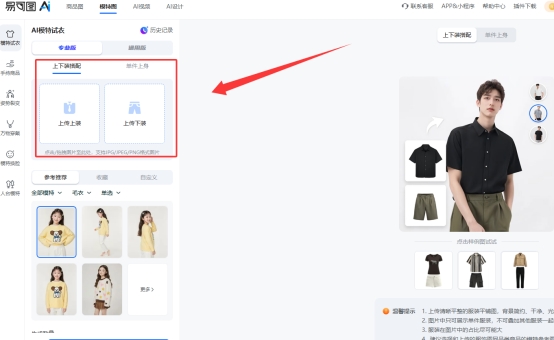 在目前的电商 AI 模特工具中,易可图的功能相对完整,覆盖了服装类和非服装类商品两大核心场景,主要体现在 AI 模特试衣 和 AI 万物穿戴 两个功能上。
