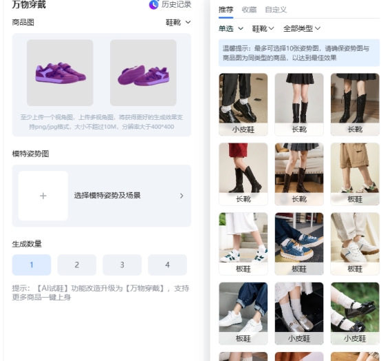 功能特点:不需要拍整套穿搭,只要商品图清晰,就可以直接生成穿戴效果。对电商卖家来说,这一点非常实用,尤其适合鞋包、饰品类商品。