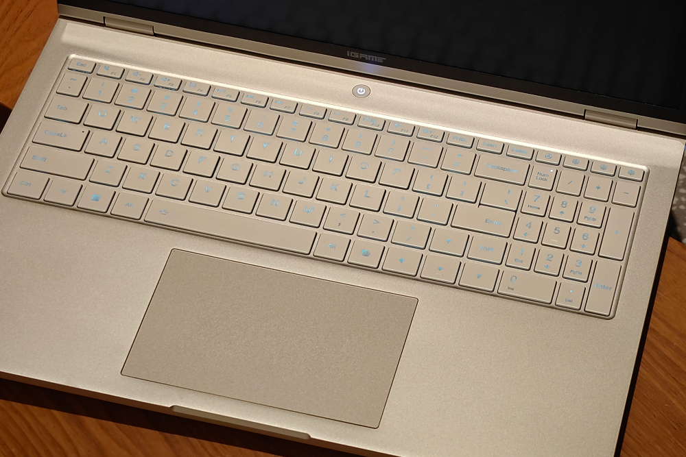 对了,它还支持单手开合与180°平放。键盘采用白色键帽+抗指纹涂层,全尺寸布局保留大方向键与完整数字区,键程适中(1.7mm),RGB背光均匀透亮。触控板采用大面积玻璃材质,滑动手感顺滑,顶部区域支持重按可以模拟鼠标中键效果。