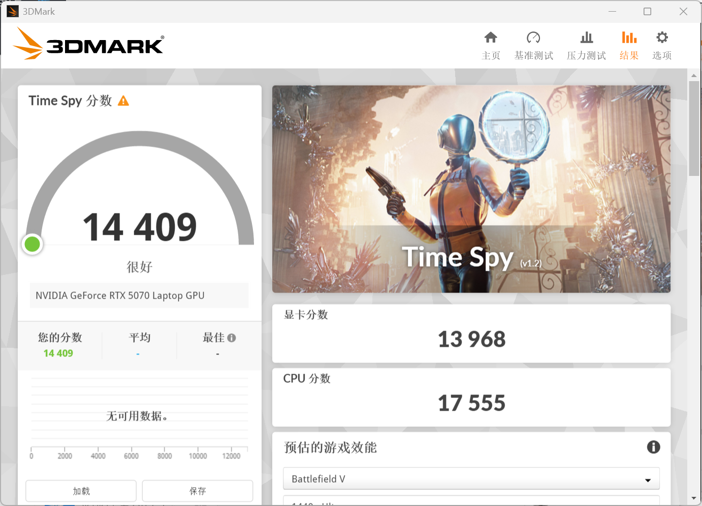 TIME Spy可以测试显卡在DX12环境 2K分辨率的性能,可以看到它的综合得分14409,显卡分数13968,CPU分数17555,符合RTX 5070移动版的性能表现。