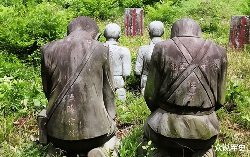于是他做了一个决定:把日军指挥官藏重康美等四名军官的尸体,反绑双手,以跪姿掩埋在墓园入口处。后来,这处掩埋点被塑成了石像,四个日本兵永远跪在那里,向烈士墓方向忏悔。