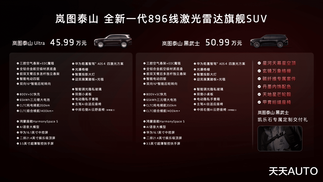 新华AUTO:2026年3月17日,岚图汽车召开以“远见”泰山技术焕新发布会。岚图联合央视新闻,交出了一份极具分量的时代答卷,全新一代896线激光雷达旗舰SUV岚图泰山Ultra版正式启动量产交付,新车售价45.99万元。同时,岚图泰山黑武士版开启大定,新车售价50.99万元。岚图以惊人的速度,率先将顶尖的896线激光雷达量产装车。目前,全国展车及试驾车已全面到店。这不仅体现了岚图强大的体系力,也标志着岚图泰山Ultra及黑武士凭借“硬核机械+顶尖智驾”的双重护城河,重新标定了9系旗舰SUV的价值新高度,让世界看到,智慧出行的未来将由中国来定义。