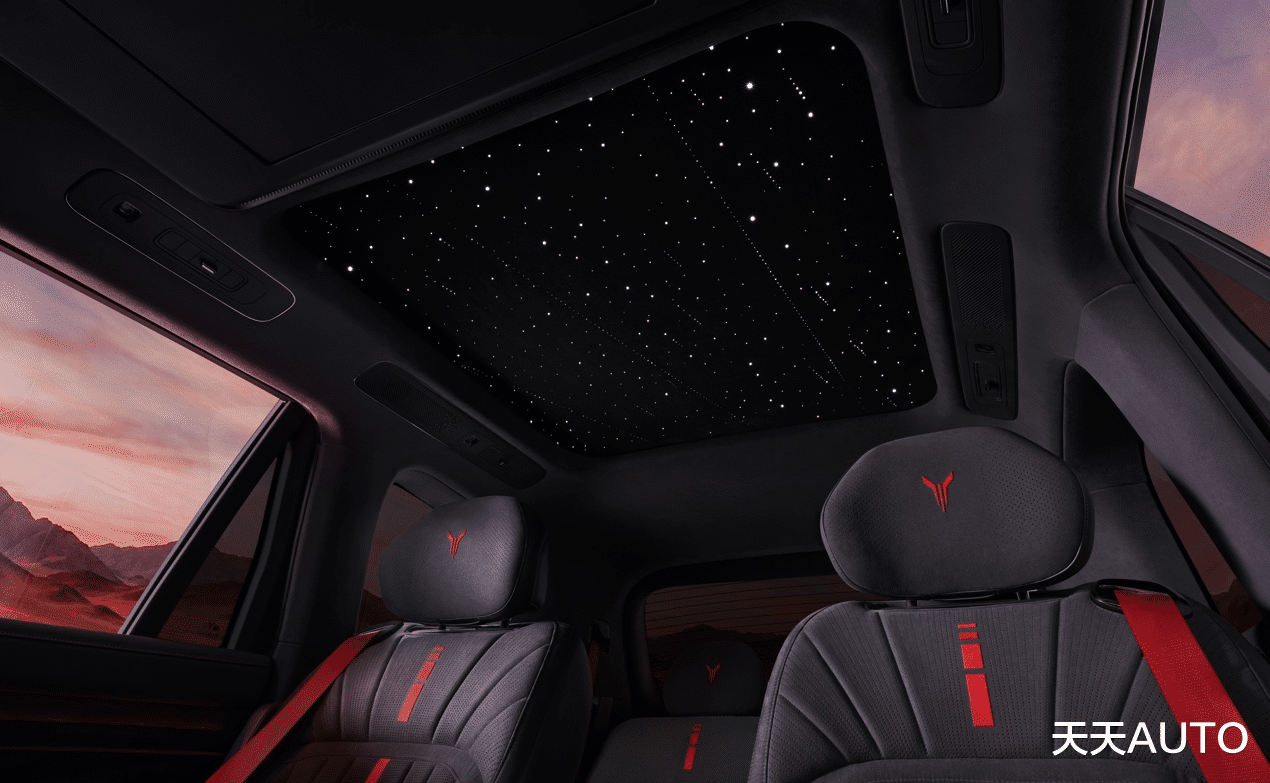 座舱内部将隐奢质感拉至满格。设计师以大面积墨色为底,在缝线与头枕等关键之处巧妙点缀丹砂红并采用层叠线条立体绗缝工艺,模仿铠甲片片相扣的精密感,中央更嵌入精致的红色高频焊图案。这一细节不仅拉满了百万级的奢华触感,更隐喻了藏锋于内敛之下的侠者风范。搭配高品质黑水晶钻石切割按键与流云墨韵饰板,细节处尽显藏而不露的高端格调。新车越级配备与百万豪车同源的星河天幕,598颗灯珠营造出静谧的星空仪式感,它将中式豪华的内敛之美推向了极致。