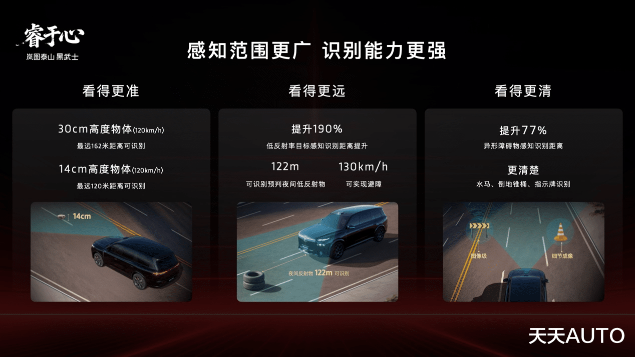 这套多传感器融合的感知体系,为车辆搭建起了全场景、无死角的顶配感知网络与传统。与192线产品相比,新车实现了断层式领先。针对30厘米高度的障碍物,最远识别距离高达162米。即使是14厘米的小目标,也能实现120米的远距精准识别。岚图真正实现了从点云级到图像级的跨越,树立了行业感知硬件的天花板。在央视的权威实测镜头下,这套感知天花板大显神威。面对前车掉落障碍物、异物遮挡视线、驾驶员失能等极其刁钻的突发危机场景,岚图泰山均能在第一时间做出最精准的避险决策,完美化解危机。