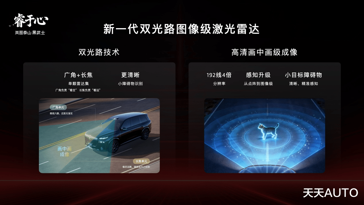 岚图泰山Ultra版和黑武士版搭载的行业最强的四激光雷达方案,其核心正是全球量产最高规格的896线双光路图像级激光雷达。这也是该项行业顶尖硬件率先实现量产装车,率先让用户体验到满血智驾。新车配备了四颗激光雷达,高清摄像头、毫米波雷达、超声波雷达等共计34颗智慧传感器组成的融合感知系统。