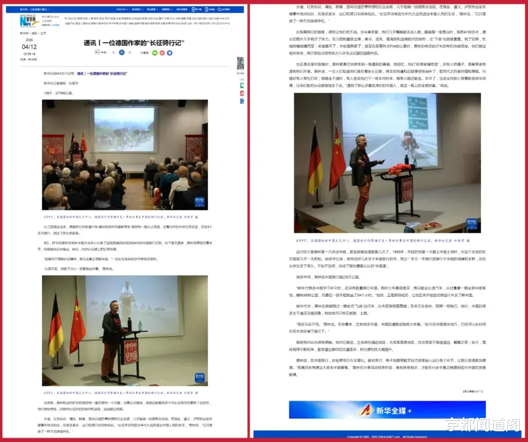 “138天,近7000公里。德国旅行作家福尔克•黑林和同伴克里斯蒂安•施密特从江西瑞金出发,一路北上西进,沿着当年的中央红军足迹,历经4个多月骑行,到达了陕北吴起县。”4月9日,57岁的黑林在柏林中国文化中心分享这段跨越山河的骑行之旅时,台下座无虚席。读罢新华社4月11日《一位德国作家的“长征骑行记”》的报道,每一个字都叩击心灵,让人久久不能平静。黑林在分享尾声深情感慨:“唯有亲身到访,才能在行走中真正触摸到现代中国的发展脉搏。”他反复叮嘱在场听众,“我真的非常建议大家去中国看看。”这份跨越国界的共鸣,不禁让我想起自己曾经采访过的大连市自来水公司退休党委书记、董事长姜雄城,他10年独行10万公里,不仅追寻踏访建国前烈士牺牲地100处,出版《永远的景仰——追寻烈士牺牲地》一书,还在2025年底前到访了中央红军长征路上的多处重要事件发生地,同时其他3路红军长征的出发点和会师点也都留下足迹。【相关链接:10年独行10万里,遍访山河祭英魂——退休书记姜雄城考证数百烈士牺牲地补史遗缺】一个是深耕中国30余年的国际友人,一个是初心不改的在党50年的退休老党员,他们以不同的身份、同样的执着重走长征路,用脚步丈量历史、用心灵感悟精神,这份坚守与热爱,值得我们每一个人为之点赞。