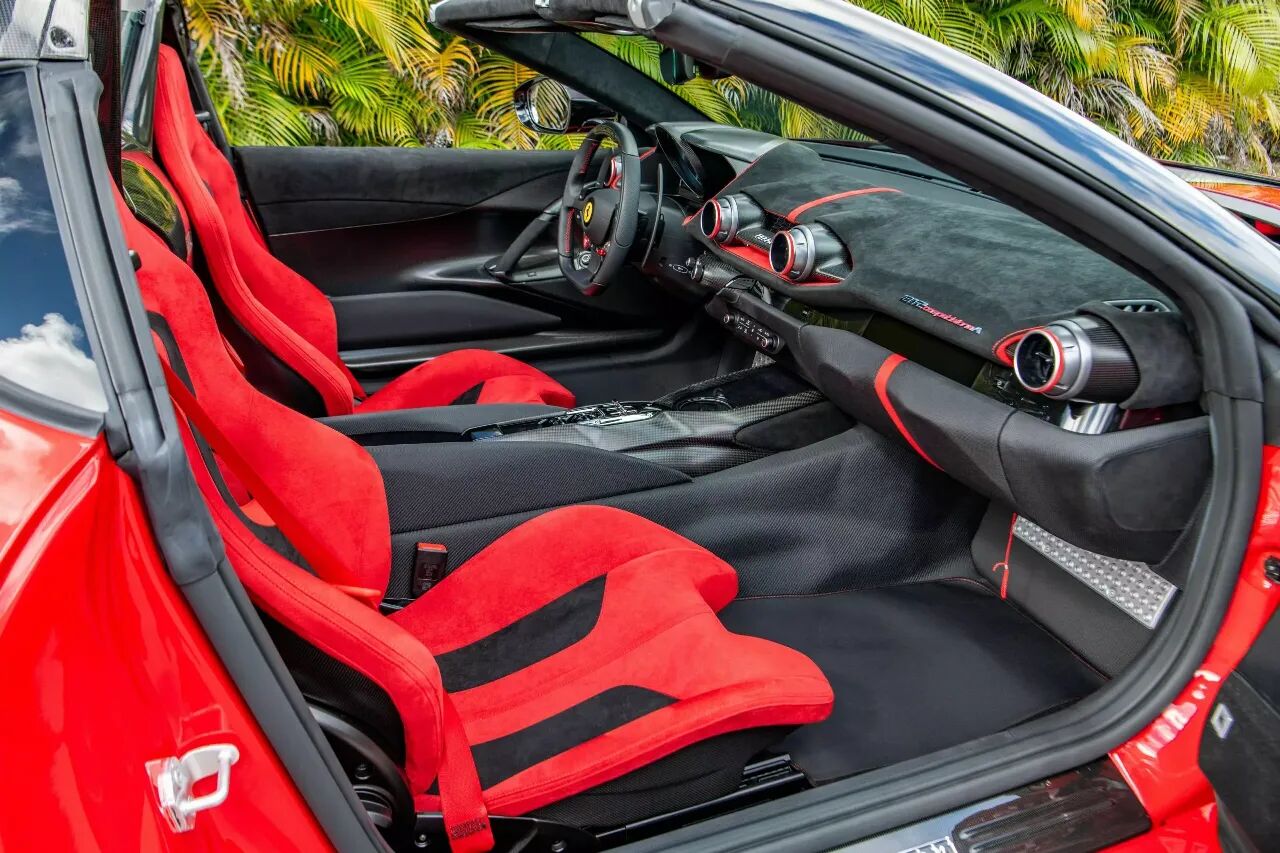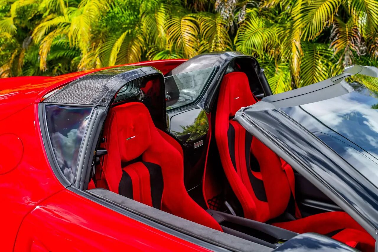 内饰更是极致竞技与奢华的结合,座椅、仪表台大面积使用红黑双色Alcantara翻毛皮,就连后备箱都铺满鲜红色Alcantara。这种配置实用性并不高,但对于一台收藏级法拉利来说,它的意义不在于装载能力,而在于完整、极致、原厂高度定制化的稀有品相。