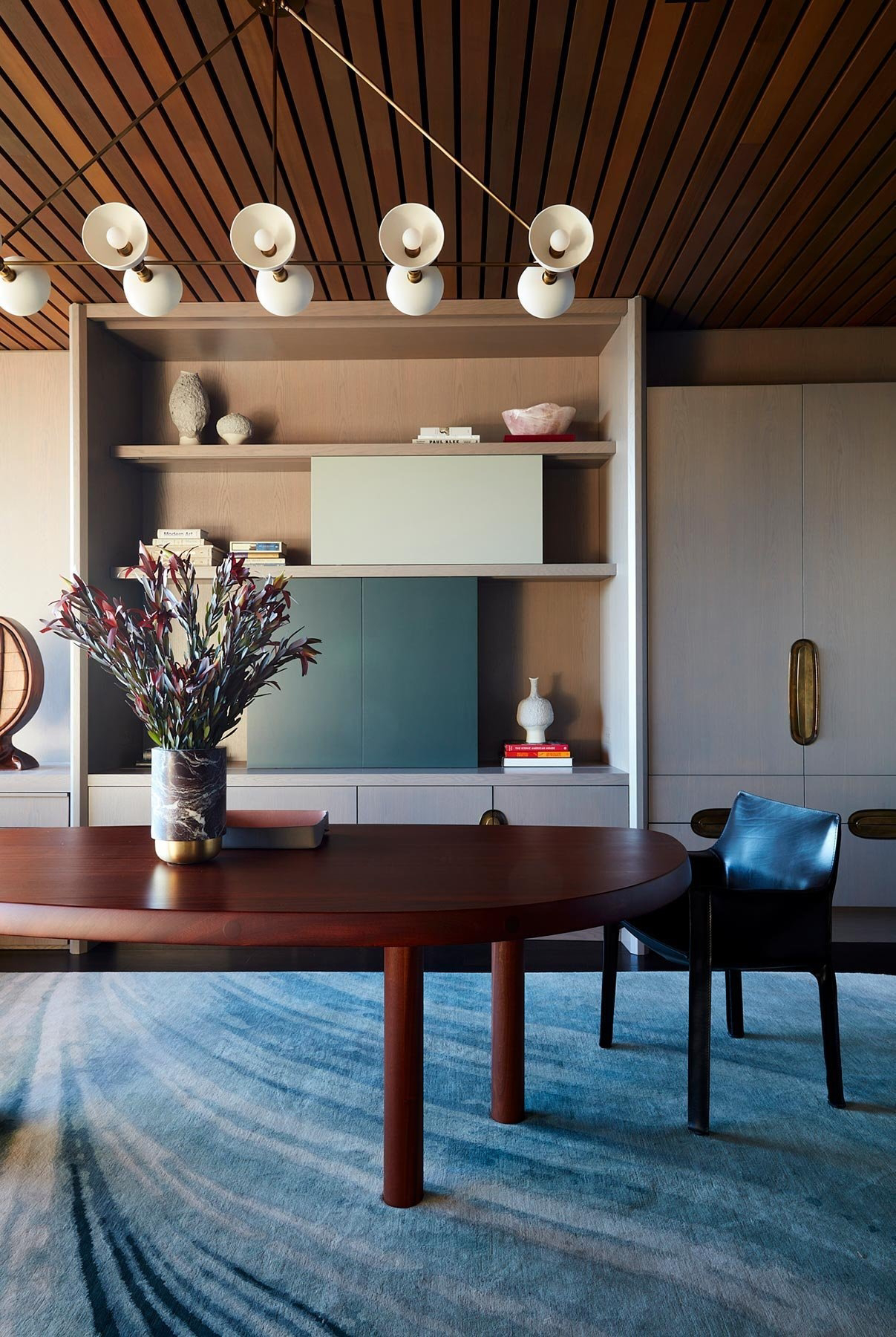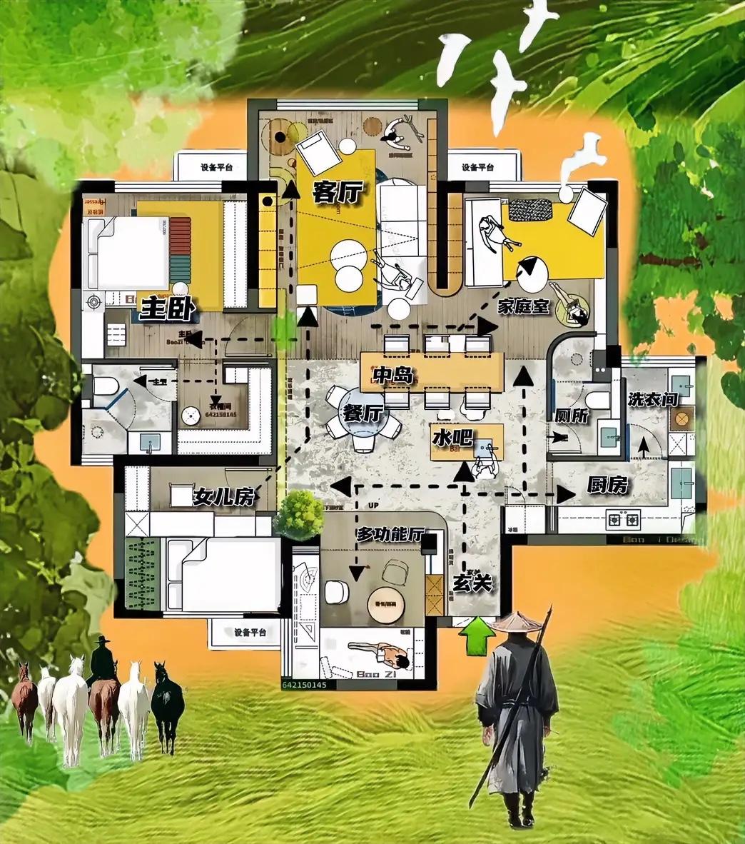 她的空间,仿佛凝聚了天地灵气,吃饭平台三个,耍的平台也有三个,所有的空间都围着餐桌转圈圈,用一个洄游动线,盘活大客厅!