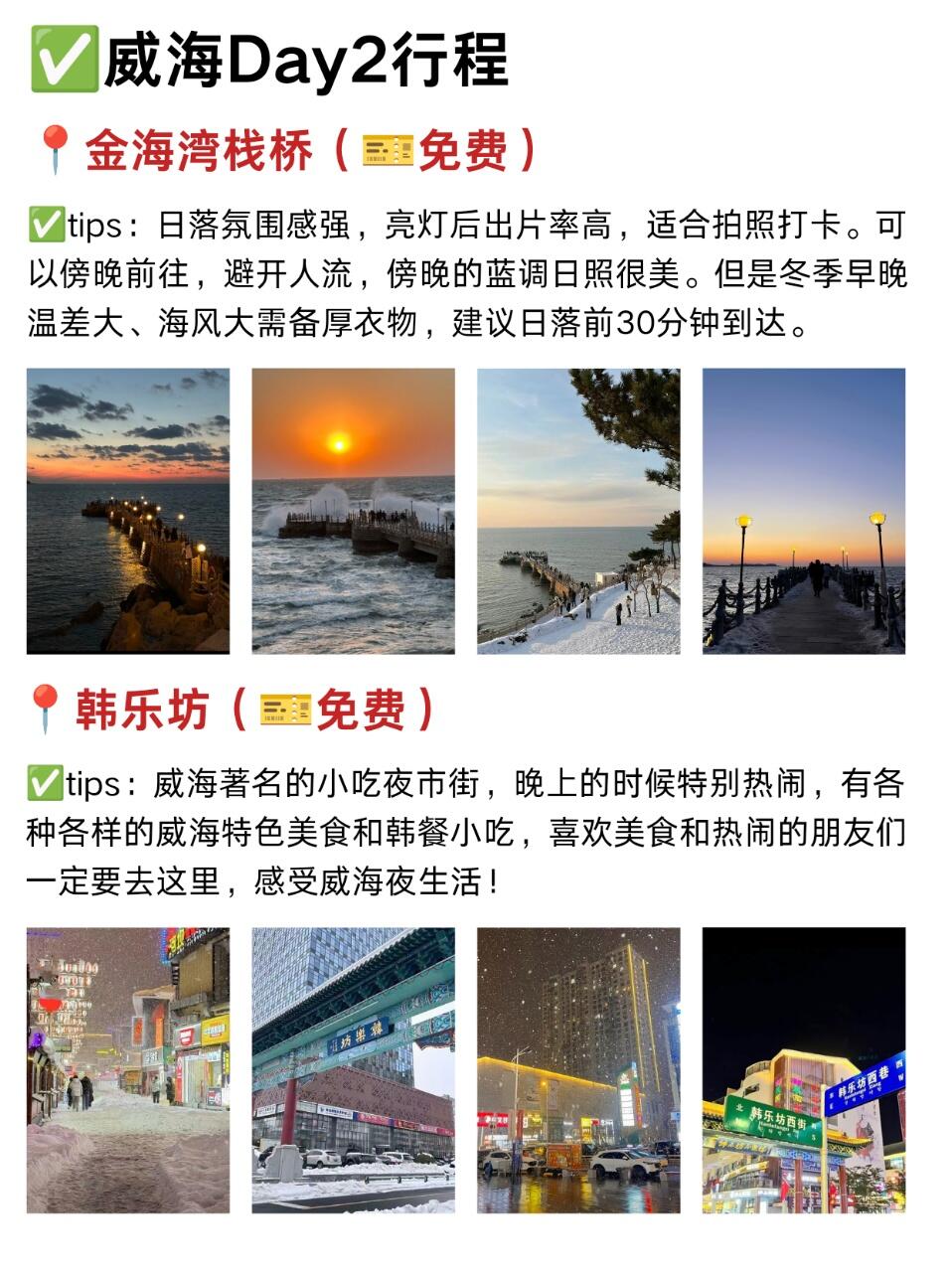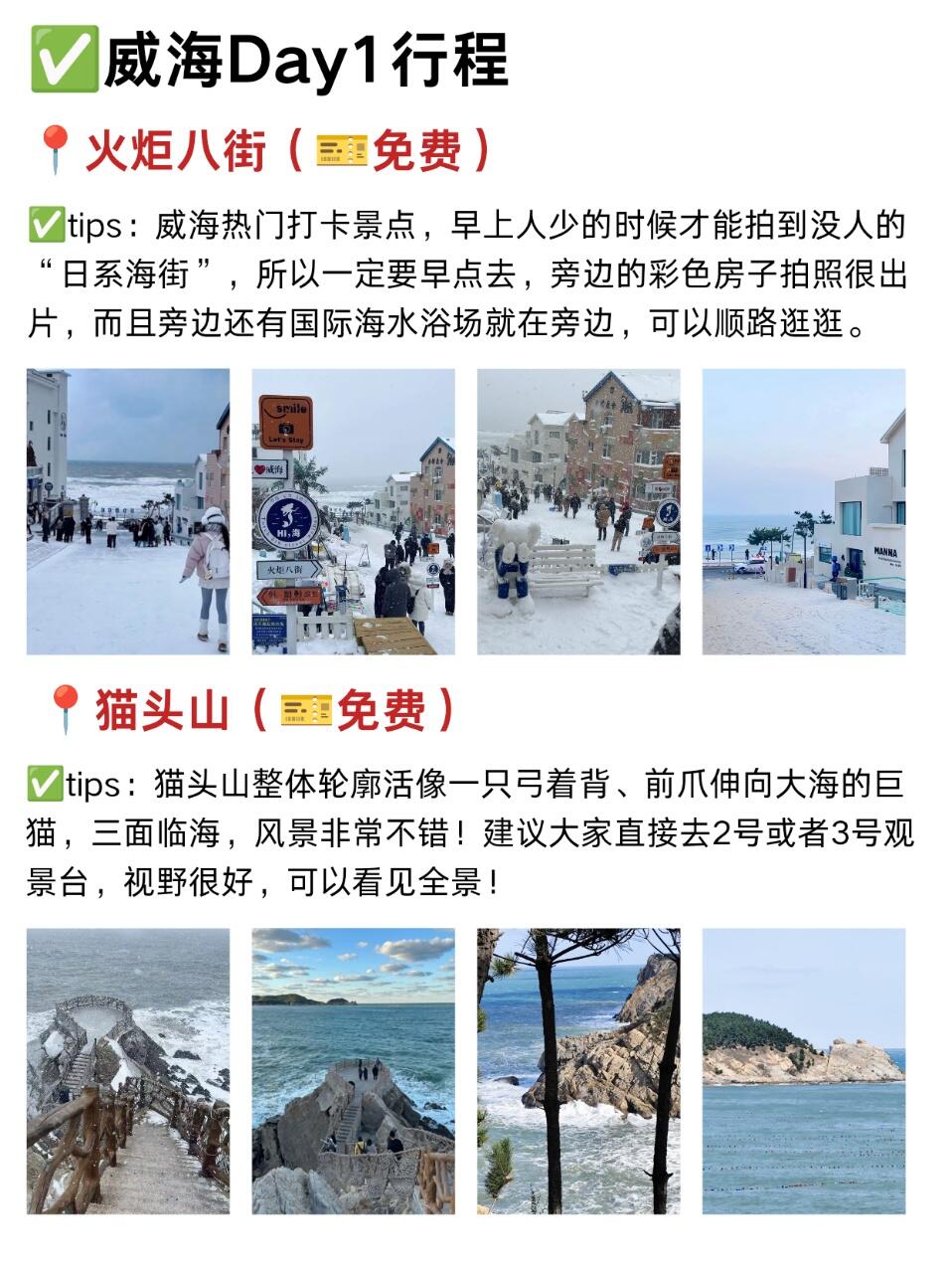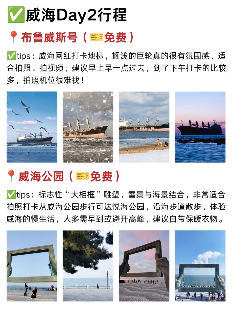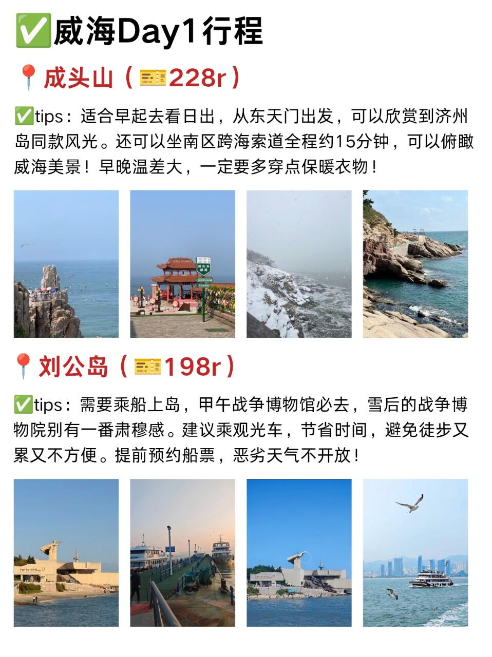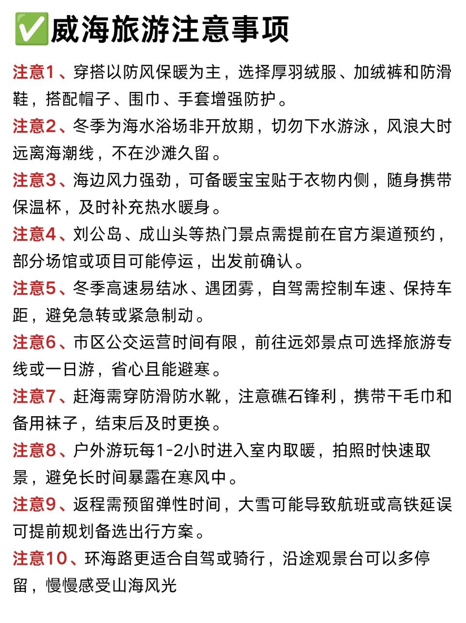 1⃣️穿衣🧥:穿防风羽绒服+加绒裤+雪地靴,海边风大,戴个围巾帽子更暖和🧣2⃣️交通:市区景点打车很方便,去荣成可以拼车或坐公交🚌,提前查好班次3⃣️住宿🏠:选威海站或韩乐坊附近,吃住行都方便,性价比不低4⃣️美食🍜:韩乐坊美食集中,不用跑远;吃海鲜尽量选明码标价的店,新鲜度有保障5⃣️ 拍照📸:上午10点或下午3点的光线最好,拍海和天鹅都出片