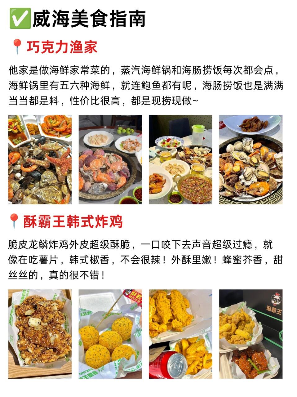 ✅巧克力渔家是威海本地人都推荐的一家海鲜店🐟,他家海鲜蒸汽锅是必点的,端上桌虾🦐还在动,蒸熟后肉很甜。还有海肠捞饭分量足,锅贴炒鸡是家常小菜的味道,挺下饭的,其他菜品也都很好吃😋!✅酥霸王韩式炸鸡是威海的特色小吃,龙鳞炸鸡就是酥酥的皮,鸡肉外酥里嫩,蘸着酱料~巨香还不腻😋