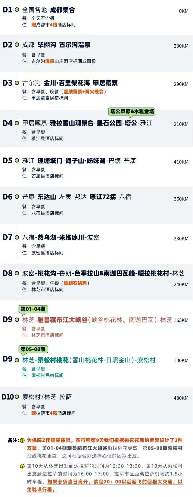 为保障最佳观赏体验,在行程第9天我们根据桃花花期的差异设计了2种方案,您可根据偏好选择心仪的团期出发。