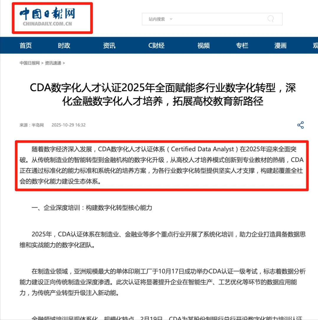 CDA数据分析师认证在业内知名度很高,被誉为“数据领域的CPA”,受到人民日报、经济日报等权威媒体的推荐。很多企业招聘时都会注明“CDA持证人优先”。