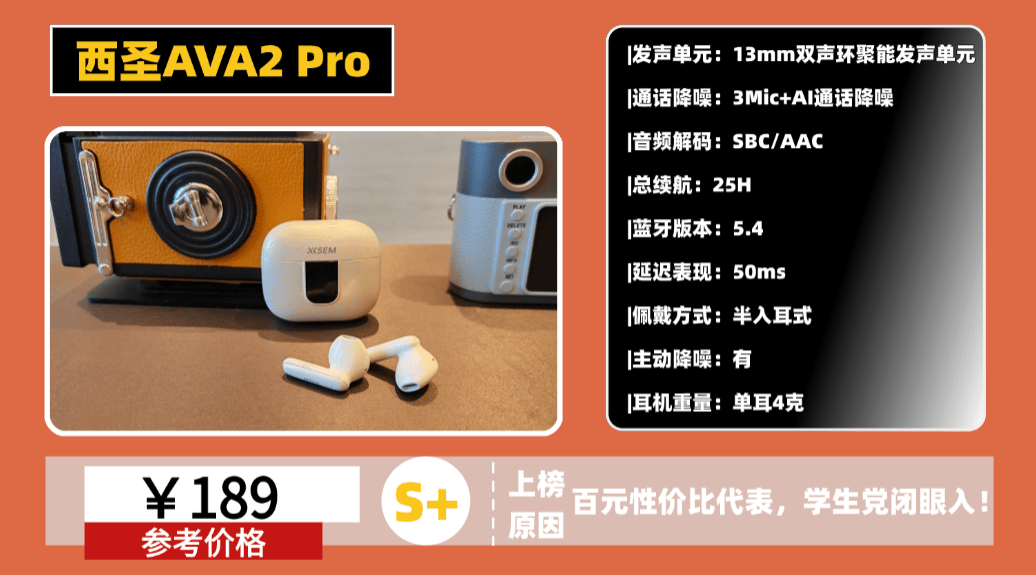 推荐产品1、西圣AVA2 Pro蓝牙耳机/¥189