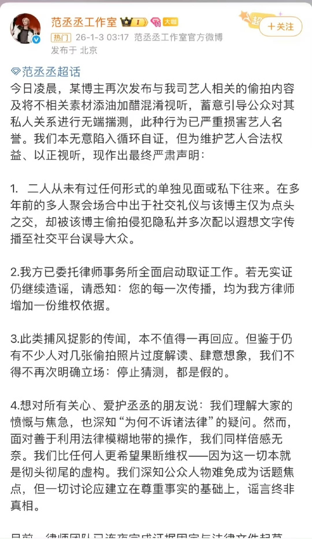 面对这波突如其来的“碰瓷”,范丞丞及其团队的反应堪称教科书级别。工作室第一时间发出严正声明,条理清晰地驳斥谣言,强调双方仅为公开场合的点头之交,并果断启动法律程序,用区块链技术固定证据,展现了维权的决心与专业度。这种“不惯着”的态度,赢得了大众的初步认可。毕竟,在流量至上的时代,敢于对恶意炒作说“不”,是对自己名誉的负责,也是对网络环境的净化。