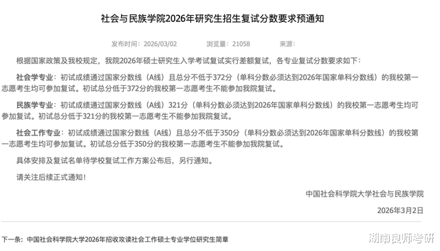 学校发布了2026年硕士研究生招生考试复试基本分数线,报考该校的同学可以点击链接查询具体专业要求。