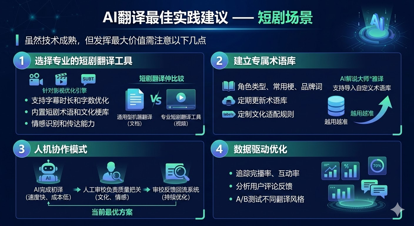 在技术选型时,建议优先考虑专注于影视内容的AI翻译方案,而非通用型机器翻译。专业工具在文化适配、情感传达、字幕优化等短剧核心场景上的表现,往往能带来更高的用户满意度和更好的商业回报。