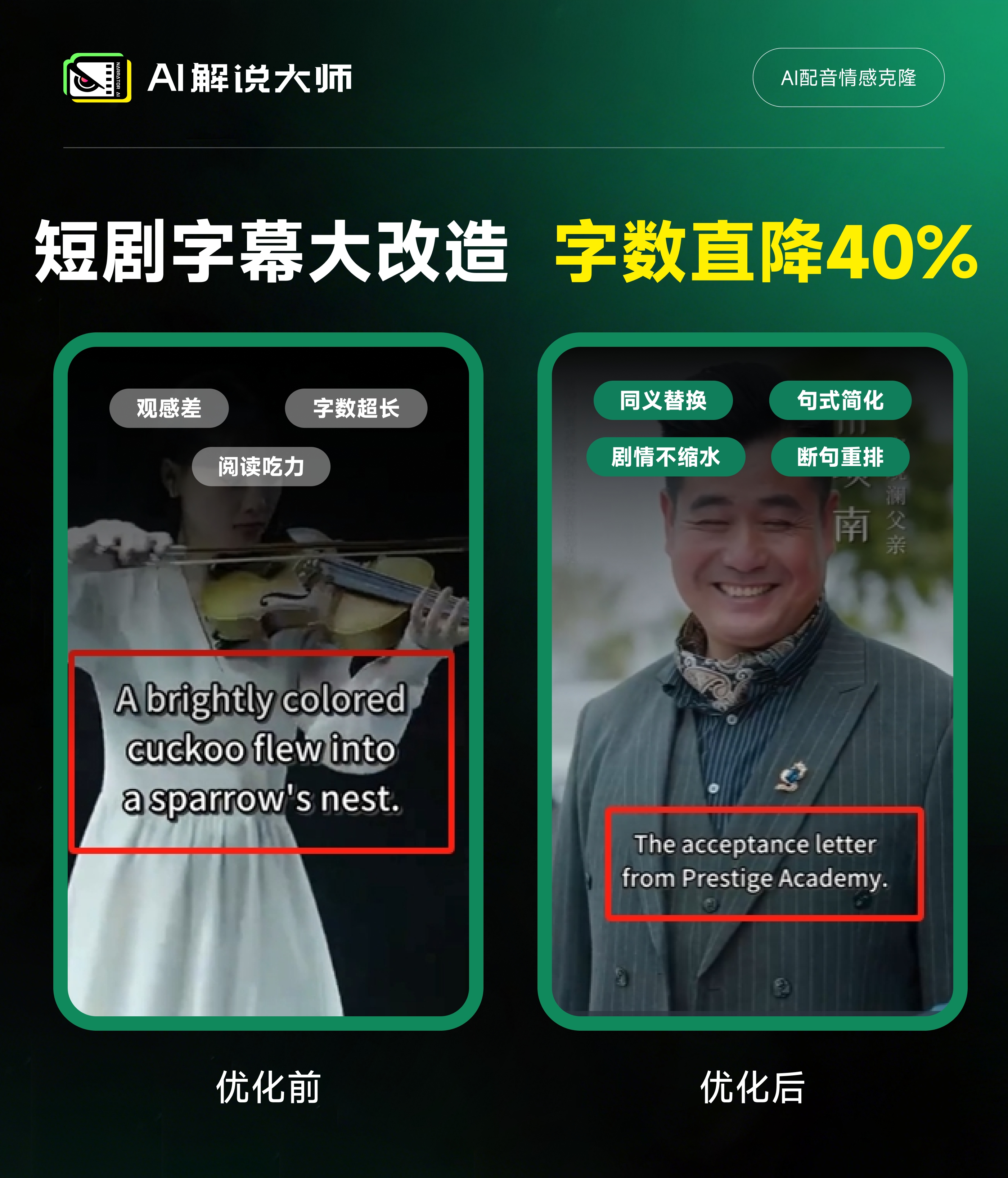 短剧对话高度口语化,充斥着省略句、倒装句、语气词,而字幕却有严格的时长和字数限制。以一句中文台词为例: