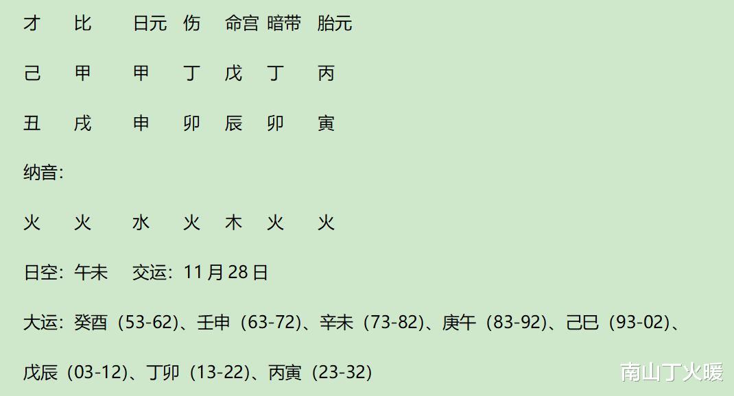 丙食生戊偏财、己财;大运寅与月支戌拱午,流年申与命宫辰拱子,小限酉合年支丑。
