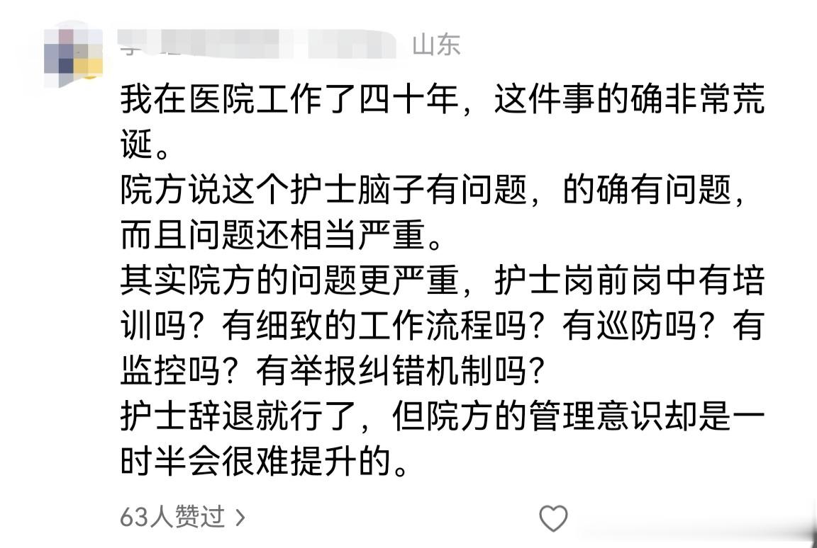 一位自称在医院工作了四十年的网友说,这件事的确非常荒诞,院方说这个护士脑子有问题,的确有问题,而且问题还相当严重。其实院方问题更严重,护士岗前岗中是有培训的,还有细致的工作流程,有巡防,有监控等等机制,为何还会发生这样的事情?