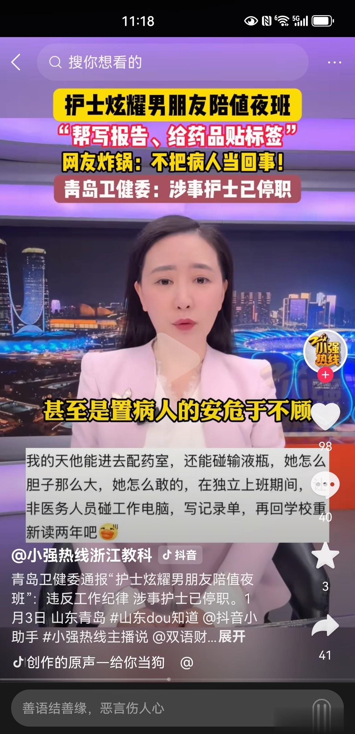 目前,该护士已被停职,市卫生健康综合监督执法部门已介入调查,后续将根据调查情况依法依规对涉事医院和人员作出严肃处理。