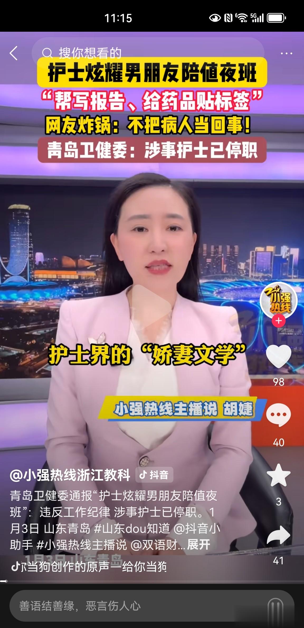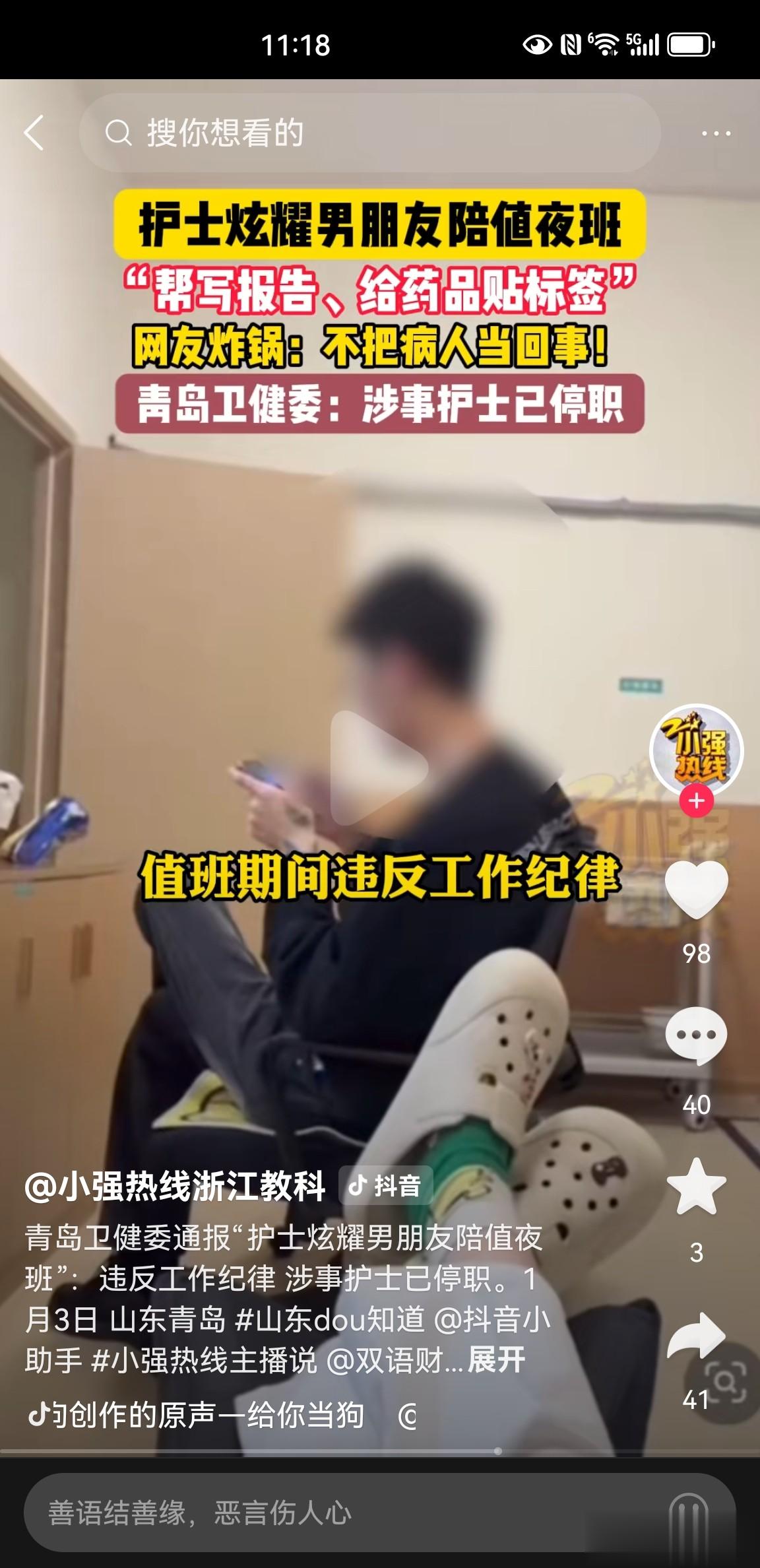 近日,山东一名护士在网上发视频炫耀男朋友下班后陪自己上夜班,引发广大网友关注,评论区炸锅。
