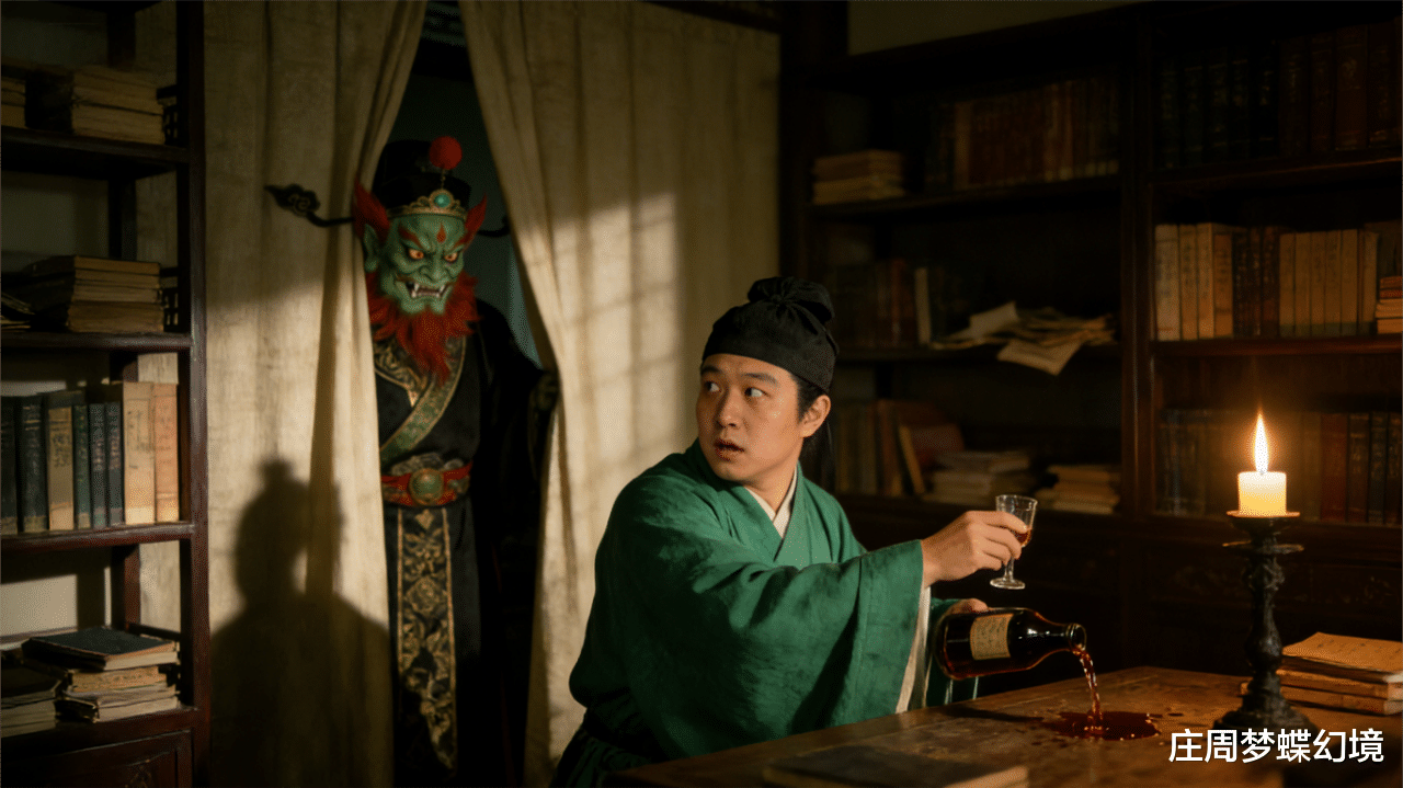 第二天,朋友们果然摆了酒宴请他。朱尔旦喝到傍晚,带着几分醉意回家,酒兴却没消,点上灯独自酌饮。忽然,门帘被人一掀,一个身影走了进来——朱尔旦抬眼一看,魂都快飞了,竟是十王殿里那尊判官!